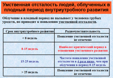➢ При облучении в плодный период (с 13 по 20 сутки) – гибели и грубых уродств почти нет.