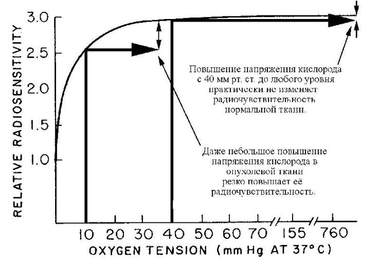 Знание причин возрастания устойчивости клеток в условиях гипоксии имеет огромное значение при радиотерапии злокачественных образовании. Известно, что цель радиотерапии опухолей — убить опухолевые клетки и как можно меньше повредить нормальные ткани, окружающие опухоль. Однако в обычных условиях применению облучения для удаления опухоли препятствует тот факт, что опухолевая ткань является более устойчивой, чем нормальная ткань. Это связано с тем, что обычно в нормальных тканях парциальное напряжение кислорода (рО2) составляет 40‑60 мм рт.ст. В опухолях же, которые, как известно, снабжаются кровью значительно хуже, чем нормальные ткани, напряжение кислорода значительно ниже и поэтому и радиоустойчивость опухолей значительно выше, чем у нормальных тканей.