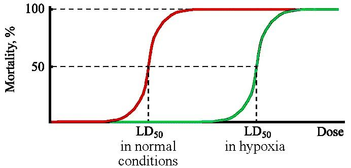 Кислородный эффект - явление усиления поражающего действия ионизирующего излучения в присутствии кислорода в момент облучения. То есть кислород является радиосенсибилизатором. Однако на практике часто приходится обсуждать не сенсибилизирующие свойства кислорода, а радиозащитное действие гипоксии. Для количественной оценки кислородного эффекта используют величину ФИД (фактор изменения дозы), который в данном случае называют также коэффициентом кислородного усиления (ККУ). Кривая гибели животных после облучения в условиях гипоксии сдвигается в область более высоких доз как показано. (17.2.2)