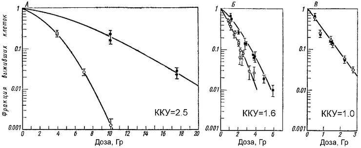 Наиболее четко кислородный эффект наблюдается при облучении редкоионизирующими излучениями, т.е. когда линейная плотность ионизации (ЛПИ) низкая. С увеличением ЛПИ кислородный эффект быстро уменьшается и полностью отсутствует при α‑облучении, характеризующимся высокой ЛПИ. Представлены различные варианты проявления кислородного эффекта в зависимости от применяемого вида ионизирующего излучения. Как видно из рисунка, самая высокая величина ККУ = 2.5 наблюдается при действии рентгеновского излучения. (17.2.5)