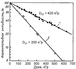 Кислородный эффект был обнаружен не только на клеточном и организменном уровне, но и в экспериментах с биологическими макромошт лекулами. Основные результаты по кислородному эффекту были получены главным образом с ферментами и нуклеиновыми кислотами, причём наиболее важные и однозначные данные были получены по инактивации ферментов. Кислородный эффект почти всегда наблюдается при облучении сухих ферментов. Результаты по инактивации РНК-азы при g-облучении в вакууме и присутствии кислорода. В этих экспериментах ККУ = 2.1. (17.2.6)