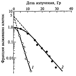 Кривые выживаемости клеток китайского хомячка, облученных на воздухе и в азоте. Как видно из рисунка, для снижения фракции выживших клеток до 0.01 (1%) от исходной при облучении на воздухе потребовалась доза 8.9 Гр, а при облучении в аноксии (отсутствие кислорода) – 25 Гр. Величина D0 равна 1.5 и 4.5 Гр, соответственно. Таким образом, кислород повысил радиочувствительность клеток в 2.8 раза (25/8.9 = 2.8), т.е. он сенсибилизировал клетки с ФИД = 2.8. (17.2.4)