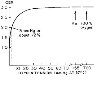 Именно этот эффект используется при радиотерапии опухолей. При повышении содержания О2 во вдыхаемом воздухе происходит увеличение концентрации О2 как в нормальных тканях, так и в опухоли. Однако повышение содержания кислорода практически не вызывает увеличение радиочувствительности нормальных тканей, но приводит к значительному увеличению радиочувствительности опухоли. Для этой цели применяют гипербарическую оксигенацию (вдыхание чистого кислорода под давлением 2‑3 атм.). Однако, надо отметить, что этот метод далеко не всегда повышает рО2 в опухолевой ткани. Другим подходом практического применения кислородного эффекта в радиотерапии опухолей является использование феномена реоксигенации опухолевых клеток. Ван Путтен и Каллман показали, что популяция опухолевых клеток состоит из гипоксических и аэрированных, т.е. негипоксических клеток. Обычно всего лишь 15% клеток являются гипоксическими. При действии облучения на такую популяцию гибнут в первую очередь аэрированные клетки, т.к. они более радиочувствительные. Однако в экспериментах было обнаружено, что через определённый интервал времени после облучения популяция опухолевых клеток восстанавливает соотношение гипоксических и оксигенированных клеток на первоначальном уровне, т.е опять доля гипоксических клеток снижается до 15%. Таким образом, происходит реоксигенация клеток и появление радиочувствительной аэрированной фракции клеток, что позволяет опять эффективно применить ионизирующее излучение для их уничтожения.