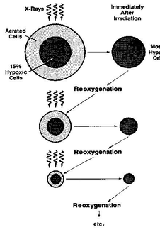 Как видно из рисунка, ионизирующее излучение вызывает гибель аэрированных клеток, так как они более радиочувствительные, после чего в популяции остаются только устойчивые гипоксические клетки. Однако после процесса реоксигенации в опухоли восстанавливается первоначальное соотношение между аэрированными и гипоксическими клетками, что позволяет опять эффективно применить облучение. И так несколько раз до полного уничтожения опухоли. Доказано, что радиотерапия неэффективна в отношении тех опухолей, в которых процесс реоксигенации не наблюдается.