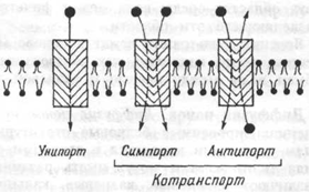 | С S — молекулы переносчика и субстрата. с0 и ci — концентрации переносчиков в свободном состоянии на наружной и внутренней сторонах мембраны cs0 и csi — переносчики, связанные с субстратом so и s1 — концентрации субстрата в наружном и внутреннем растворах соответственно к1—к8 —константы скоростей отдельных стадий. Выражение для скорости потока субстрата можно получить, решая систему уравнений, описывающих стационарное состояние, при dco/dt = d[csi]/dt = dco/dt = 0. Отсюда следует, что поток субстрата J равен J=k1c0s0-k2cs0=k3cs0-k4csi=k5csi-k6cisi=k7ci-k8c0 Через биологические мембраны кроме воды и ионов путем простой диффузии проникают многие вещества (от этанола до сложных лекарственных препаратов). В то же время даже сравнительно небольшие полярные молекулы, например, гликоли, моносахариды и аминокислоты практически не проникают через мембрану большинства клеток за счет простой диффузии. Их перенос осуществляется путем облегченной диффузии. Облегченной называется диффузия вещества по градиенту его концентрации, которая осуществляется при участии особых белковых молекул-переносчиков. Транспорт Na+, K+, Сl-, Li+, Ca2+, НСО3- и Н+ могут также осуществлять специфические переносчики. Характерными чертами этого вида мембранного транспорта являются высокая по сравнению с простой диффузией скорость переноса вещества, зависимость от строения его молекул, насыщаемость, конкуренция и чувствительность к специфическим ингибиторам — соединениям, угнетающим облегченную диффузию. Все перечисленные черты облегченной диффузии являются результатом специфичности белков-переносчиков и ограниченным их количеством в мембране. При достижении определенной концентрации переносимого вещества, когда все переносчики заняты транспортируемыми молекулами или ионами, дальнейшее ее увеличение не приведет к возрастанию числа переносимых частиц — явление насыщения. Вещества, сходные по строению молекул и транспортируемые одним и тем же переносчиком, будут конкурировать за переносчик — явление конкуренции. Различают несколько видов транспорта веществ посредством облегченной диффузии (рис. 1.13):