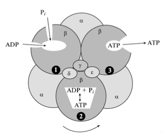 Конформационные изменения идут на всех трех бета-субъединицах при повороте гамма-субъединицы на 120 градусов. Активный центр сменяет все три конформации при повороте на 360 градусов. Синтез АТФ в закрытом центре идет спонтанно, без затраты Е. Энергия дельта мю Н+ расходуется на смену конформаций и выхода АТФ из активных центров фермента исключительно.