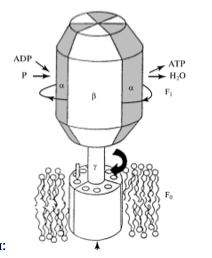 F0 – гидрофобный, встроен в мембрану, формирует канал, по которому ионы Н+ пересекают мембрану по градиенту потенциала. Вращение сопровождается конформационными изменениями каталитических центров F1 – комплекса. Альфа и бета не вращаются, вращается гамма-ножка.