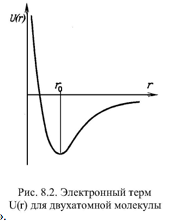 Типы объемных взаимодействий. Первичная структура полимерной цепи определяется химическими или валентными взаимодействиями. Объемные взаимодействия в основном определяют вторичную структуру макромолекул. Общим критерием стабильности молекулярной структуры является наличие минимума на кривой U(r) зависимости энергии взаимодействия от расстояния между взаимодействующими частями. Картинка «Электронный терм для двухатомной молекулы».