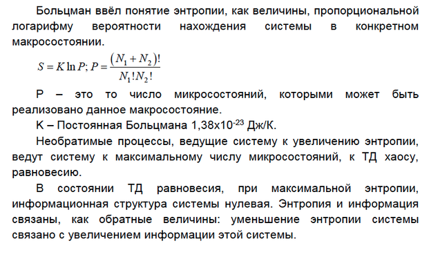 Согласно формуле Больцмана, энтропия определяется как логарифм числа микросостояний, возможных в данной макроскопической системе