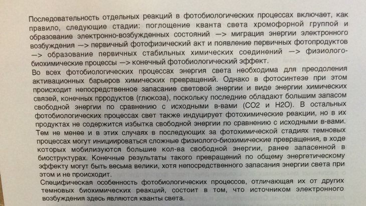 3. Проявление специфического фотобиологического эффекта. Например, перенос протона, регуляторный акт, изменение проницаемости мембран, биосинтез.