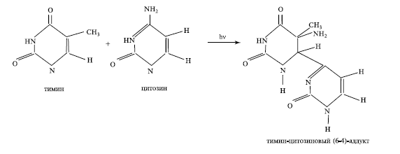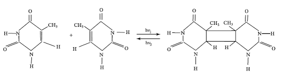 Эта реакция быа обнаружена при облучении замороженных растворов Тимина. Она состоит в соединении двух оснований по 5,6 двойной углеродной связи с образование кольца циклобутанового типа.