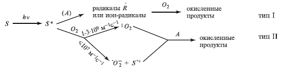 Фотосенсибилизированные деструктивные реакции в большинстве случае протекают с участием кислорода. Эти процессы, получившие название фотодинамических, разделяют на два типа по механизму, в зависимости от того как энергия светового возбеждения передается от сенсибилизатора(S) к биологическому субстрату(A).