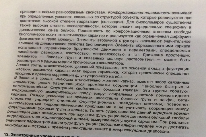 Наиболее быстрые и мелкомасштабные флуктуации присущи боковым группам. Эти группы образуют жидкоподобную опушку вокруг спиральных участков полипептидного каркаса и играют роль демпфирующей среды. Иерархия во временах релаксаций позволяет представить динамику белковой глобулы как флуктуации в жидкоподобной капле, армированной упругим полипептидным каркасом. Диффузия лигандов внутри глобулы происходит лишь при образовании флуктуационных полостей или "дырок". Появление "дырки" внутри глобулы может быть инициировано образованием ее вначале в растворителе на поверхности глобулы. Вероятность этого процесса обратно пропорциональна вязкости растворителя. За счет конформационных движений поверхностная группа белка заполняет "дырку" в растворителе. "дырка" теперь оказывается уже в наружном слое белка. Далее, за счет движений групп второго и третьих слоев "дырка" диффундирует внутрь глобулы, обеспечивая появление дополнительных флуктуационных полостей. Форма этих полостей в белке непроизвольна, а имеет вид флуктуирующих щелей, параметры которых определяются геометрией жестких элементов белкового каркаса. Решение диффузионных уравнений позволяет вычислить скорость диффузии частиц через систему таких флуктуирующих щелей. Так, при диффузии в миоглобине лиганд СО должен пройти несколько "ворот", которые открываются за счет конформационных движений. Скорость диффузии зависит от диаметра лиганда , амплитуды флуктуации и времени релаксации щели, которая определяется жесткостью и микровязкостью стенок. Общее время прохождения СО в миоглобине составляет 10-7 с и соответствует сложению времен конформационных релаксаций нескольких ворот в глобуле. В жесткой молекуле белка, где отсутствуют внутримолекулярные движения и структурные флуктуации, диффузия лиганда должна быть сопряжена с преодолением больших активационных барьеров (до 100 ккал/моль). Эти барьеры настолько замедлят движение лиганда, что оно практически станет бесконечно медленным в масштабах биологического времени. В реальных биополимерах с плотной упаковкой именно структурные флуктуации делают возможным перенос лигандов внутри молекулы, что важно для ее функциональной активности.