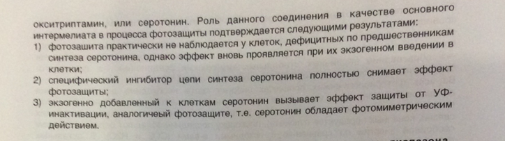 2. Фотозащита. При предварительном облучении клеток длинноволновым ультрафиолетом значительно снижается их чувствительность к коротковолновому ультрафиолету. Это снижение чувствительности обеспечивается синтезом серотонина, который берёт на себя часть поступающего излучения.