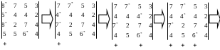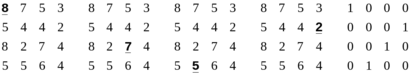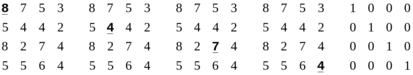 4. Все отмеченные столбцы уменьшаются на минимальную величину необходимую, чтобы какая-то из основ отмеченных столбцов стала равной хотя бы одному элементу в данной строке, но не в отмеченных столбцах. Такой столбец отмечается, элемент именуется основой, а бывшая основа - обычным элементом.