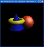 Программа предназначена для демонстрации модели освещения OpenGL на примере простой сцены, состоящей из тора, конуса и шара. Объектам назначаются разные материалы. В сцене присутствует точечный источник света.