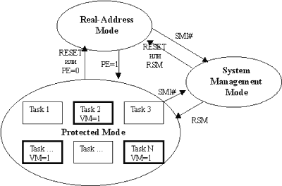 Режим системного управления предназначен для выполнения некоторых действий с возможностью их полной изоляции от прикладного программного обеспечения и даже операционной системы. Переход в этот режим возможен только аппаратно. Когда процессор находится в режиме SMM, он выставляет сигнал SMIACT#. Этот сигнал может служить для включения выделенной области физической памяти (System Management RAM), так что память SMRAM можно сделать доступной только для этого режима. При входе в режим SMM процессор сохраняет свой контекст в SMRAM (контекст сопроцессора не сохраняется) по адресу SMM Base и передает управление процедуре, называемой обработчиком System Management Interrupt, по адресу SMM Base+8000h (по умолчанию SMM Base содержит значение 30000h). Состояние процессора в этот момент точно определено: EFLAGS обнулен (кроме зарезервированных битов), сегментные регистры содержат селектор 0000, базы сегментов установлены в 00000000, пределы - 0FFFFFFFFh.
