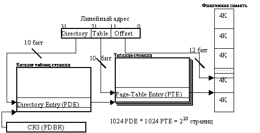 В процессе страничной трансляции адресов полученный линейный адрес разбивается на три части. Старшие десять бит (Directory) линейного адреса являются индексом элемента из каталога таблиц. По этому элементу определяется физический адрес таблицы страниц. Биты 21-12 (Table) линейного адреса выбирают элемент из этой таблицы страниц. Выбранный элемент определяет физический адрес страницы. Младшие 12 бит (Offset) линейного адреса определяют смещение от начала страницы.