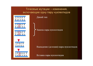 нонсенс-мутации: образование бессмысленного кодона => терминация трансляции, миссенс-мутации: изменение кодона, приводящее к изменению а/к.