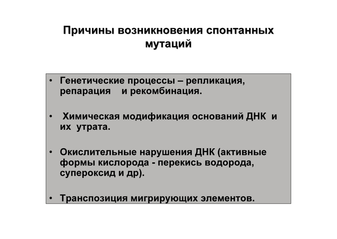 Спонтанные мутации возникают в естественных условиях в результате нормальных клеточных процессов или при взаимодействии клеток с окружающей средой. Уровень спонтанного мутагенеза специфичен для каждого вида и контролируется на генетическом уровне. Уровень спонтанного мутагенеза является балансом между возникновением и исправлением ошибок. Частота спонтанного мутагенеза в среднем составляет 10-5-10-7 /(на ген* на клетку*на поколение)