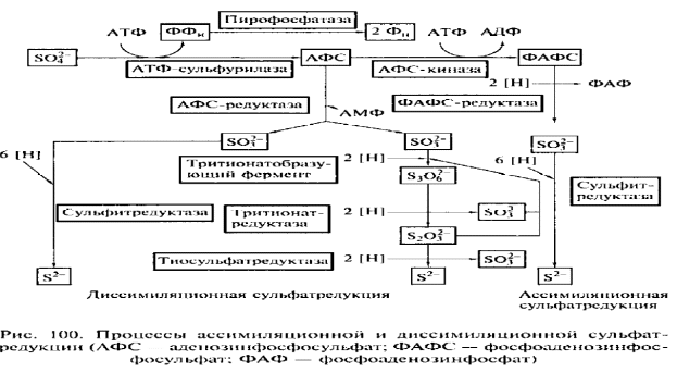 При сульфатном дыхании конечным акцептором электронов служит сульфат. Физиологическую группу бактерий, восстанавливающих сульфат, называют сульфатредуцирующими, дссульфа- тирующими или сульфидогенными. Сульфатредукторы широко распространены в таксономических группах, но все они, в отличие от нитратредукторов, строгие (облигатные) анаэробы. Обычно обитают в морских донных осадках. Большая часть сероводорода в природе возникает благодаря сульфатному дыханию (или диcсимиляционной сульфатредукции):