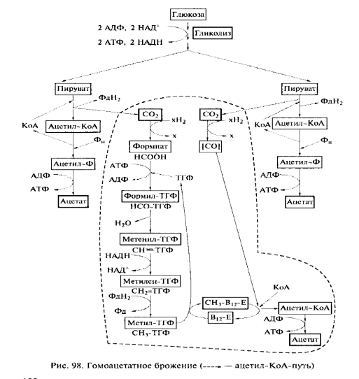 Гомоацетатное брожение, продуктом которого является только ацетат, хотя и называется брожением, однако часть реакций происходит за счет анаэробного дыхания. Микроорганизмы, его осуществляющие, широко распространены в анаэробной зоне, это строгие анаэробы, способные перерабатывать богатый набор субстратов.