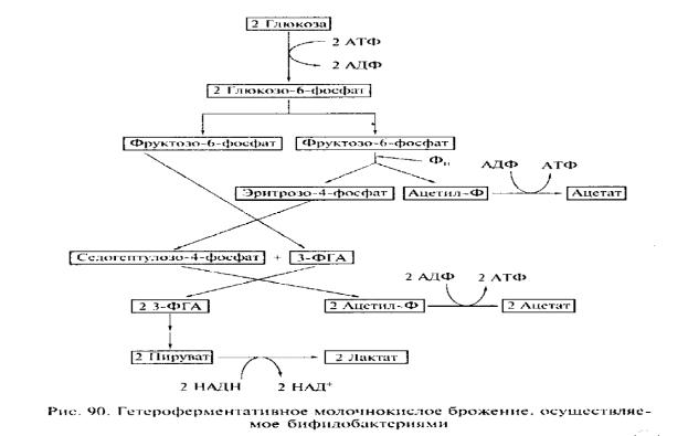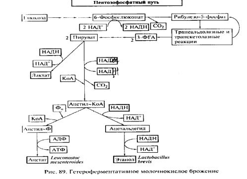 когда лак-тата образуется -90% и только 10% приходится на другие продукты (ацетат, ацетоин, этанол). При гетероферментативном молочнокислом брожении сахара сбраживаются через пенто-зофосфатный путь и лактата образуется -50 %.