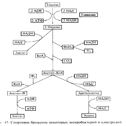 Некоторые клостридии и энтеробактерии проводят брожения, в которых спирт является побочным продуктом .В зависн мости от условий набор продуктов брожения сильно варьируем: ацетат, этанол, СО2 или лактат.