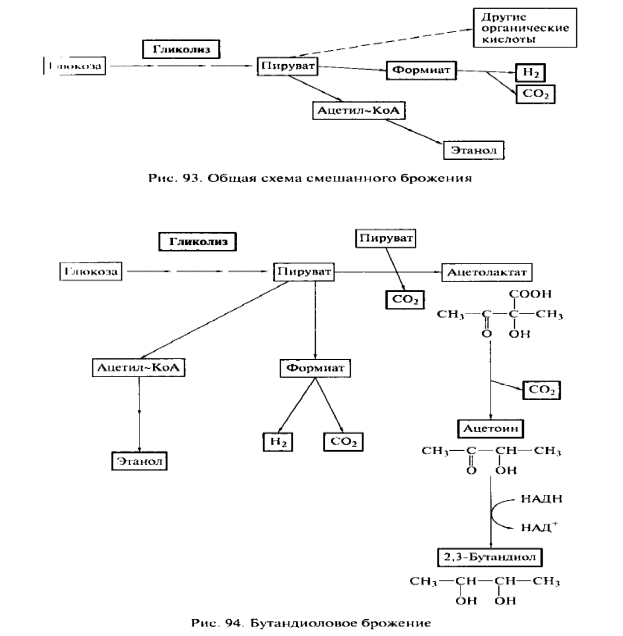 Смешанное {муравьинокислое) брожение, названное по характерному, но не главному, продукту, осуществляют микроорганизмы, объединенные в порядок Enterobacteriales. Такое брожение приводит к образованию этанола и сложной смеси органических кислот (ацетата, лактата, сукцината, формиата). Формиат сначала может накапливаться, а затем расщепляться с помощью гидрогенлиазы на Н> и СО2. Порядок Enterobacteriales содержит несколько родов: Escherichia. Klebsiella, Shigella, Salmonella, Erwinia, Proteus, Enterobacler, Serralia и др. Это грамотрицательные, подвижные палочки с перитрихиальным жгутикованисм, бесспоровыс, факультативные анаэробы, способные получать энергию как в процессе брожения, так и за счет дыхания. Клетки содержат гемопро-теины (цитохромы, каталазу), совершенно нетребовательны к условиям роста. Близки по метаболизму к этой группе также представители родов Vibrio и Yersinia. Для родов Enterobacter, Serraiia, Erwinia, а также некоторых видов рода Bacillus характерна несколько модифицированная схема, где преобладают не органические кислоты, а 2,3-бутандиол. Иногда этот процесс называют бутандио-довым брожением.