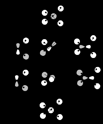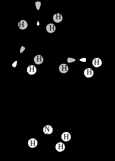 Тетраэдрическую конфигурацию можно предположить и для таких молекул, как NH3 и Н2О. Но в этих случаях один угол тетряэдра в случае NH3 и два угла тетраэдра в случае Н2О не будут заняты атомами водорода. Эти углы не будут пустыми, так как в них будут находиться неподеленные пары электронов со спаренными спинами: