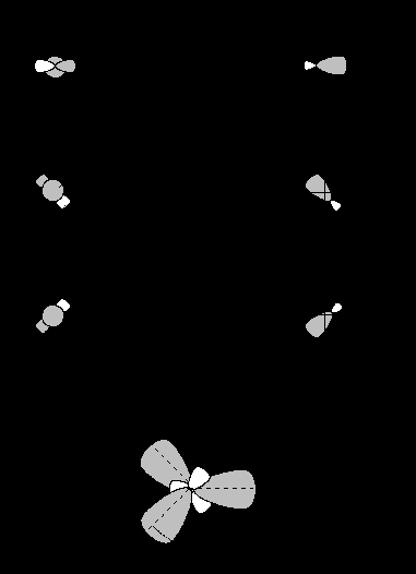 Чтобы изобразить орбитали, представленные на рис. 1.14, необходимо затратить довольно много времени и иметь достаточные навыки в рисовании, что не всем доступно. Поэтому обычно используют приближенные эскизы, показывающие симметрию и узловые свойства орбиталей, правила построения которых будут даны в главе 2. Такие эскизы для молекулы СН4 приведены на рис. 1.15. Эскизные представления МО полезны тем, что на них ясно видно, из каких АО образуется данная МО. Так, орбитали 1 и 8 образуются путем перекрывания в фазе или противофазе С2s и четырех H1s, орбитали 2, 3, 4- путем перекрывания только H1s, а орбитали 5, 6 и 7 - путем перекрывания орбиталей С2р и H1s. Сравнение рис. 1.14 и 1.15 показывает, что эскизные орбитали сильно искажают реальную картину, но симметрию и узловые свойства передают правильно. Поскольку при рассмотрении реакционной способности органических молекул нас в первую очередь будут интересовать именно симметрия и узловые свойства, в последующих главах мы будем использовать главным образом эскизные орбитали.