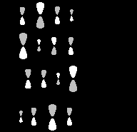 Симметрию при этом нужно понимать не в абсолютном смысле. Строго говоря, орбиталь y1 акролеина несимметрична (в отличие от бутадиена), поскольку атомные коэффициенты распределены несимметрично; о симметрии можно говорить только в топологическом смысле. Орбиталь y2 должна быть «антисимметрична» и иметь один узел в центре молекулы, орбиталь y3 «симметрична» и имеет два узла, и, наконец, орбиталь y3 «антисимметрична» и имеет три узла (между каждой парой соседних АО, как и бутадиен).