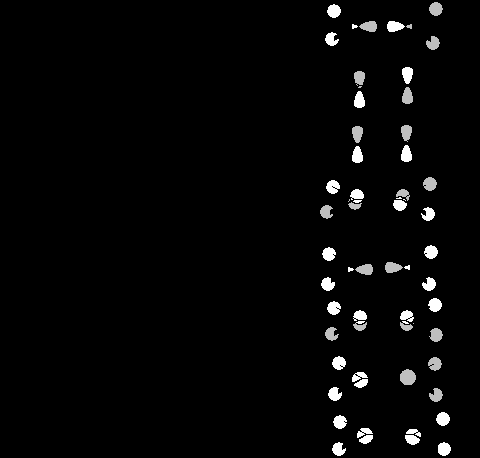 Этилен имеет 12 валентных электронов, поэтому ВЗМО будет являться шестая орбиталь c6, а НСМО - седьмая орбиталь c7. Поскольку, как и в случае этана (рис. 2.22), расщепление уровней фрагментов СН2 наибольшее для несвязывающих уровней y7, так как перекрывание этих орбиталей очень хорошее из-за их соответствующей пространственной направленности, граничными орбиталями этилена будут орбитали p-симметрии. Орбитали c6 и c7 связывают только атомы углерода. Орбиталь c4 также относится к p-типу, но она лежит ниже по энергии, так как связывает не только два атома углерода, но и атомы водорода с атомами углерода. Следовательно, эта орбиталь не будет граничной орбиталью, и химические свойства в первую очередь будут определяться орбиталями c6 и c7 .