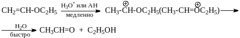 В кислотном гидролизе виниловых эфиров медленной стадией является присоединение протона по двойной связи, т.е. С-протонирование: