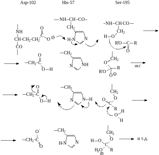Кислотно-основные реакции являются причиной каталитического действия многих ферментов. Так, химотрипсины катализируют гидролиз сложных эфиров и амидов в нейтральной среде. В этой реакции осуществляется внутримолекулярных общий кислотный и основной катализ двухстадийного переноса ацильной (R-CO-)-группы, - сначала от субстрата к оксиметильной группе серина, а затем при гидролизе ацилсерина. Третичная структура фермента такова, что три аминокислоты остатка (всего их 245), а именно аспарагиновой кислоты (N 102 в цепи), гистидина (N 57) и серина (N 195), идеально расположены в пространстве для переноса протона: