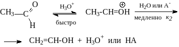 При енолизации ацетальдегида в буферных растворах сначала происходит быстрое протонирование по кислороду, а затем медленный перенос протона от углерода к основанию Аi-: