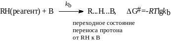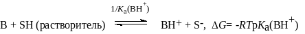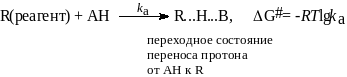 Другими словами, изменение свободной энергии DGo при кислотно-основном равновесии пропорционально изменению свободной энергии активации DG# (раздел 3.3.7.г) при переходе от реагентов к переходному состоянию переноса протона.
