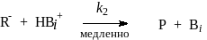 Это уравнение отражает общий кислотный катализ кислотой АiН. На первый взгляд кажется довольно странным, что реакция, медленной стадией которой является атака основанием, катализируется кислотой. Однако концентрация [АiН] связана с концентрацией как [H3O+], так и [Аi-], т.е. увеличение [АiН] приводит к увеличению [H3O+], а также [Аi-] (и следовательно [RН]). Такой тип реакции называется общеосновным-специфически-кислотным катализом. Соответствующий механизм для общего основного катализа называется общекилотным-специфически-основным катализом: