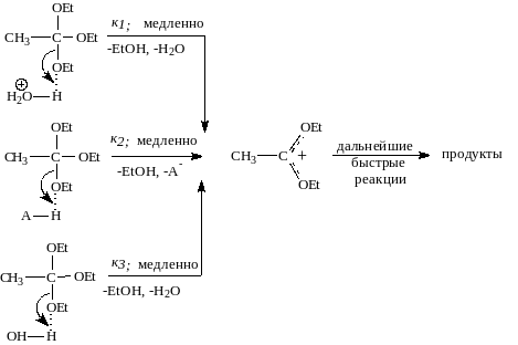 Эта реакция катализируется кислотами, но не катализируется основаниями. В мета-нитрофенолятном буферном растворе при фиксированном значении рН скорость реакции не постоянна, а увеличивается при концентрации буфера*. Это означает, что кроме Н3О+ реакция катализируется также недиссоциированным мета-нитрофенолом (АН). Общая скорость, таким образом, является суммой скоростей параллельных реакций, одна из которых катализируется Н3О+, другая АН, а третья, "некаталитическая", реакция на самом деле катализируется самой водой: