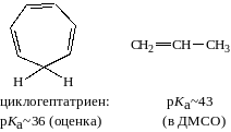 Циклогептатриен, анион которого не является ни ароматическим, ни антиароматическим (вероятно, анион не плоский), обладает относительно низкой кислотностью, близкой к кислотности аллильной СН-связи в пропилене (табл. 3.15):