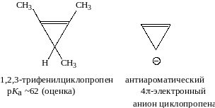 Поэтому производные циклопропена имеют рекордно высокие значения рКа, гораздо более высокие, чем рКа метана.