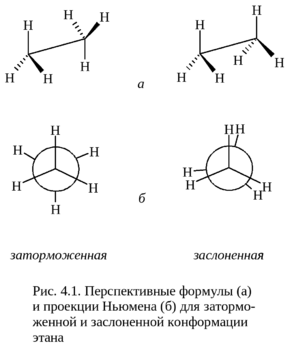 а рис. 4.1 приведены две экстремальные конформации этана в виде проекционных формул Ньюмена и перспективных формул. Конформация с самой низкой собственной энергией называется заторможенной (другие ее названия – анти- или транс-форма – менее удачны, но часто встречаются). В этой конформации все шесть атомов водорода этана максимально удалены друг от друга. Конформация с наибольшей собственной энергией называется заслоненной (другие названия: син- или цис-форма). В ней все атомы водорода максимально сближены в пространстве.Число конформаций для этана, естественно, не ограничено заслоненной и заторможенной, а бесконечно велико. Заторможенная и заслоненная конформации представляют лишь наиболее и наименее стабильные из них.