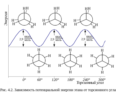 Природу возникновения барьера вращения можно объяснить следующим образом. Изменение конформации молекулы этана связано с изменением торсионного двугранного угла между плоскостями, одна из которых проходит через C – C связь и атом водорода, связанный с задним атомом углерода, а другая – через C – C связь и атом водорода, связанный с передним атомом углерода. В заслоненной конформации торсионный угол θ=0°, а в заторможенной θ=60°. Зависящая от торсионного угла энергия молекулы является суммой четырех слагаемых: