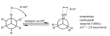 Однако вращение вокруг одинарной углерод-углеродной связи не может быть абсолютно свободным, и для превращения наиболее стабильной конформации в наименее стабильную требуется преодолеть энергетический барьер. Для этана этот барьер очень мал и, согласно экспериментальным данным, составляет 2,9 ккал/моль. Переход из заторможенной в заслоненную конформацию для этана достигается поворотом на 60° относительно двух связей C – H: