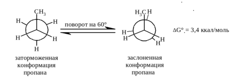 Барьер вращения для пропана несколько вше, чем для этана, и составляет 3,4 ккал/моль. Так как энергия каждого взаимодействия двух атомов водорода в заслоненной конформации составляет 1 ккал/моль, энергия взаимодействия метильной группы и атома водорода в заслоненной конформации пропана и следующих гомологов алканов может быть оценена в 3,4 - 1·2 = 1,4 ккал/моль.