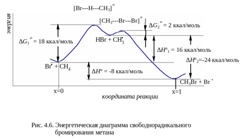 ромирование метана менее экзотермично, чем хлорирование. Первая стадия развития цепи характеризуется высоким эндотермическим эффектом: ΔHº1 = +16 ккал/моль (при хлорировании ΔHº1 = +1 ккал/моль). Это означает, что свободная энергия активации ΔG1 для данной стадии бромирования метана должна быть намного выше, чем для хлорирования. Действительно, ΔG1 для первой стадии развития цепи (18 ккал/моль; рис. 4.6) при бромировании намного превышает ΔG1 для хлорирования (4 ккал/моль). Тепловые эффекты второй стадии развития цепи при бромировании (- 24 ккал/моль) и при хлорировании (- 26 ккал/моль)весьма близки и энергия активации ΔG2 для обоих процессов тоже очень мало различаются. Значительно более высокое значение ΔG1 для бромирования указывает на то, что бромирование метана протекает с меньшей скоростью, чем хлорирование.