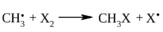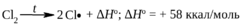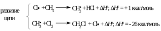 Зарождение радикальной цепи начинается с расщепления связи Cl – Cl, а не C – H в метане, так как энергия связи Cl – Cl примерно вдвое ниже энергии связи C – H в алкане. Энтальпия стадии инициирования цепи положительна. Первая стадия развития цепи практически термонейтральна, а вторая сильно экзотермична: