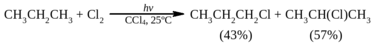 В пропане не все атомы водорода эквивалентны. Шесть из них принадлежат двум первичным атомам углерода, а два других – вторичному атому углерода. На основании чистой статистики при монохлорировании пропана следовало бы ожидать распределение изомерных 1-хлорпропана и 2-хлорпропана в соотношении 3:1. Действительно, при 500ºС соотношение этих продуктов близко к 3:1. Однако при более низких температурах наблюдается иное соотношение изомеров. Так, например, в растворе в неполярном CCl4 при хлорировании пропана при 25ºС, индуцируемом облучением, образуется смесь 43% 1-хлорпропана и 57% 2-хлорпропана: