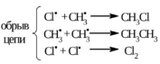 Все реакции обрыва цепи очень быстрые; скорость рекомбинации радикалов превосходит скорость стадии инициирования цепи, но поскольку в ходе реакции концентрация атомов хлора и радикалов CH3 чрезвычайно малы, цепи при хлорировании очень длинные. Стадии обрыва цепи экзотермичны, например: