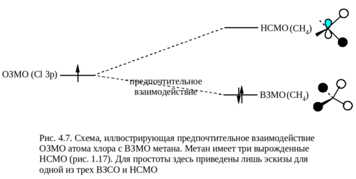 Рассмотрим для примера взамодействие атома хлора с метаном (рис. 4.7). В этом случае энергетические уровни ОЗМО атома хлора и ВЗМО метана ближе, чем энергетические уровни ОЗМО и НСМО, и возмущение между ОЗМО и ВЗМО будет главным.